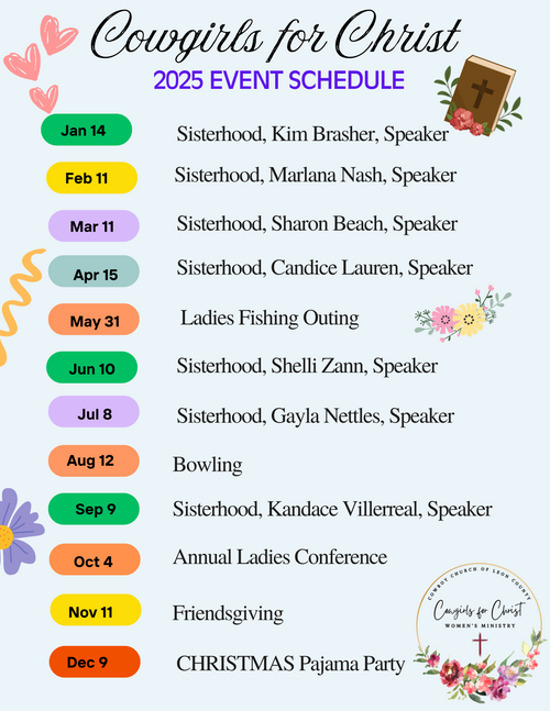 The Cowgirls for Christ Team ministers to the women in the church. This is done through Bible Study, Devotion, Dinner & Dessert, The Sisterhood, Craft Outings, Annual Conference, Christmas Party and various other activities